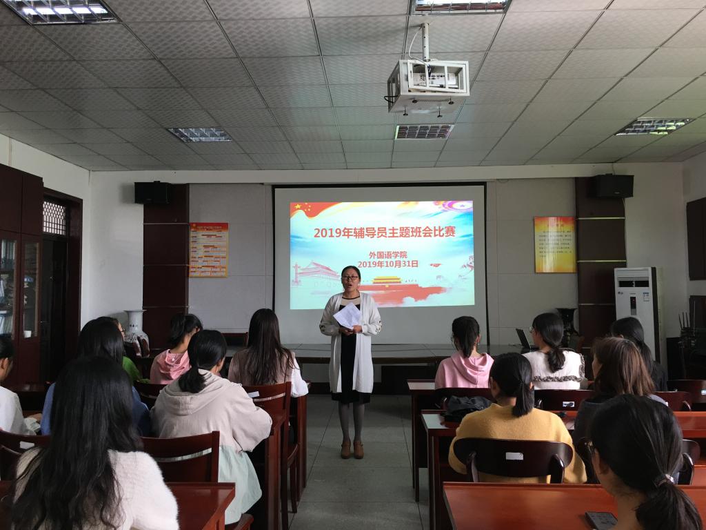 为深入学习贯彻习近平新时代中国特色社会主义思想和党的十九大精神,全面贯彻落实全国教育大会、全国高校思想政治工作会议、学校思想政治理论课教师座谈会精神,进一步提高新时代外国语学院辅导员的工作能力与育人水平,提升大学生思想政治教育质量,10月31日下午,外国语学院在会议室举行了辅导员精彩主题班会比赛。