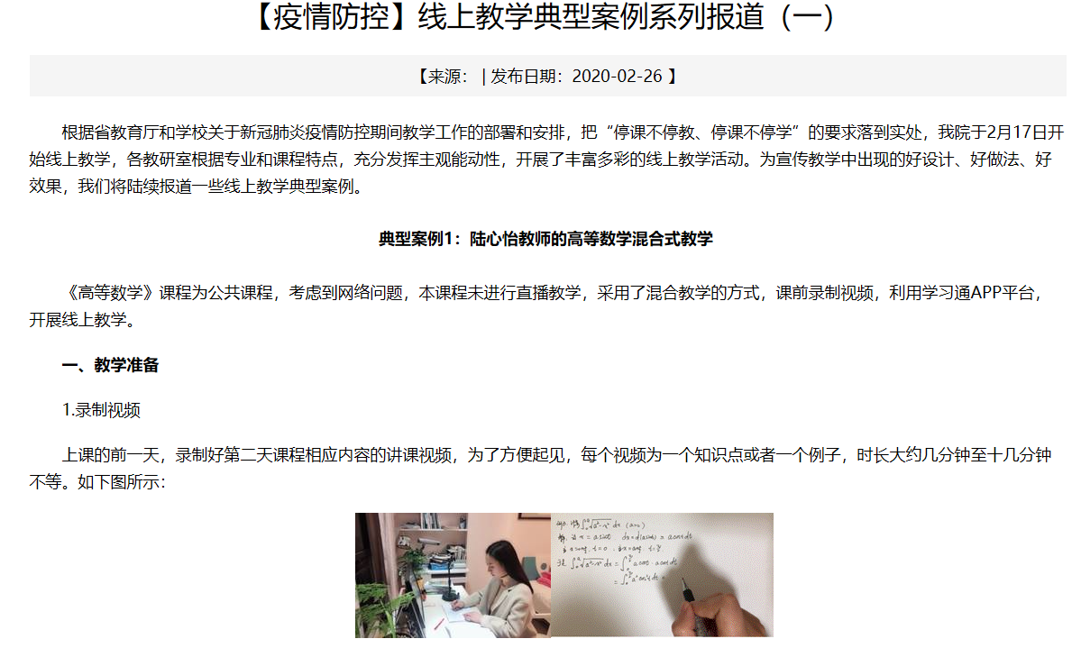 停课不停教,停课不停学。为顺利实施线上教学,学院第一时间谋划和布置,开展线上教学。学院集中组织购买手写板等线上教学工具,推荐优质课程学习资源,推荐教师参加网络讲座与培训,推送线上教学典型案例,开展线上教学经验交流与培训信息分享,课程思政研讨等有力举措,有效提升了学院教师整体线上教学水平和教学效果,保障了线上教学的顺利实施,先后涌现出陆心怡、赵舵舵、殷晓玲等多位线上教学“优秀教师”。