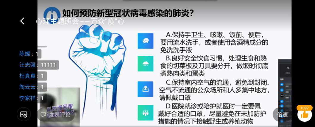 强化教育引导,夯实防疫阵地。任课教师、班级辅导员通过线上授课、网络主题班会、防疫知识宣讲等方式,加强学生思想引导、心理疏导和学习生活指导,引导班级同学坚定疫情防控信心,切实做到不造谣、不信谣、不传谣;辅导员帮助学生维护保养电脑,邮寄学习生活所需用品,把“三全育人”落实到疫情防控工作全过程。