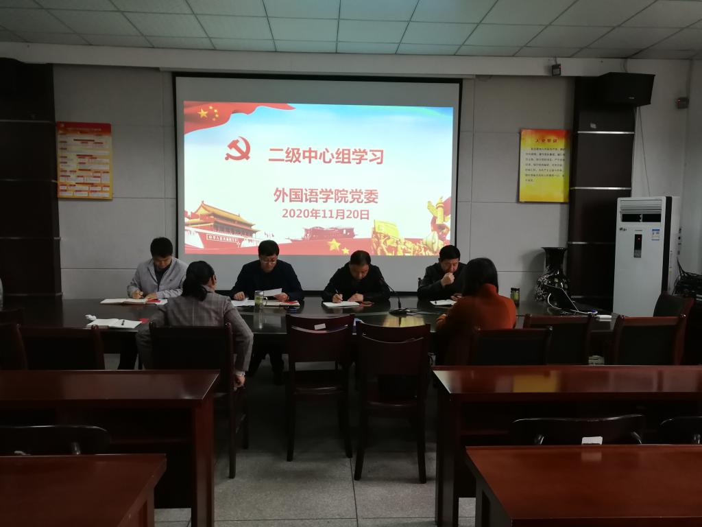 11月20日上午,外国语学院在会议室举行党委中心组学习。学习习近平总书记在中央全面依法治国工作会议上的重要讲话精神和党章。外国语学院党委委员、各支部书记参加了学习。会议由外国语学院党委书记张乐民主持。