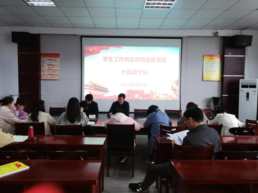 4月7日下午,外国语学院在会议室举行学生工作例会。院党委书记张乐民和全体辅导员参加了会议。会议由院党委副书记刘军主持。