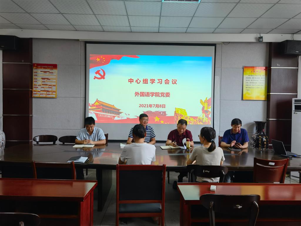 7月8日上午,外国语学院在会议室举行中心组学习研讨,开展党史学习教育。外国语学院党委成员、各支部书记参加了会议。会议由外国语学院党委书记张乐民主持。