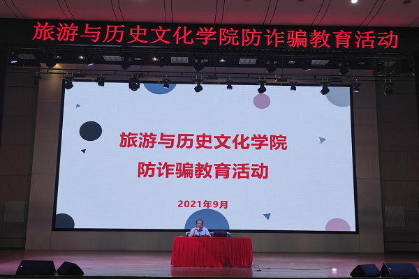 为帮助学生提高安全意识,提升防诈识诈能力,9月16日,旅游与历史文化学院在博古礼堂开展了两场防诈骗教育活动,学院2021级全体新生及2020级部分在校生严格按照常态化疫情防控要求,参加了本次活动。活动由院党委副书记杨祖勇主持。