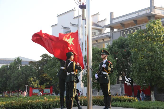 清晨七点,校国旗护卫队迎着朝阳、迈着铿锵有力的步伐护卫国旗入场。伴随雄壮的国歌,鲜艳的五星红旗在全体学生代表的注目下冉冉升起。