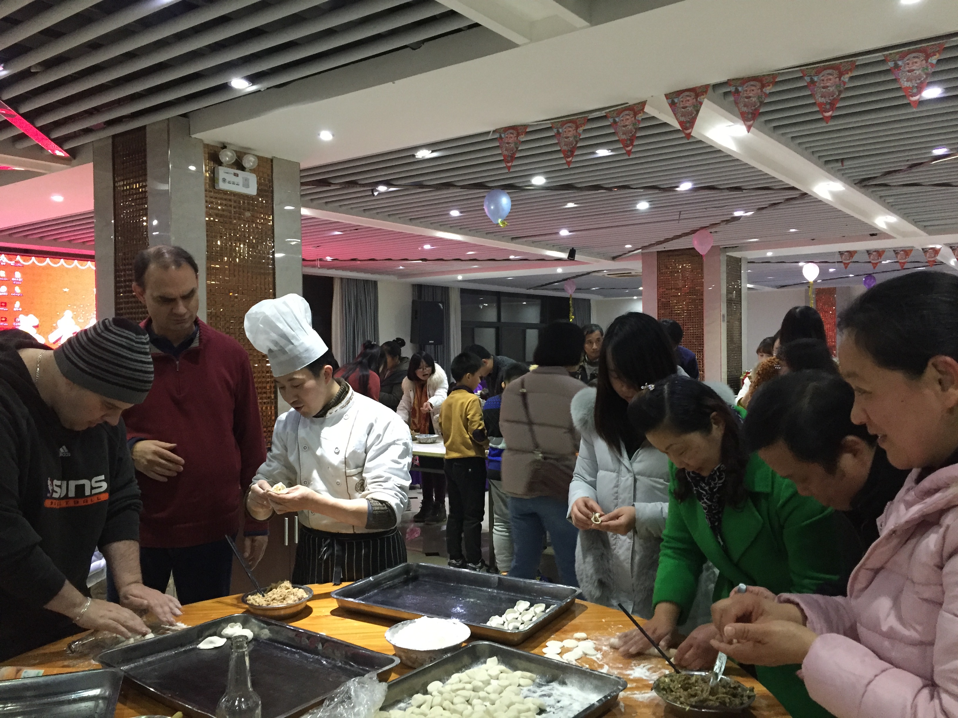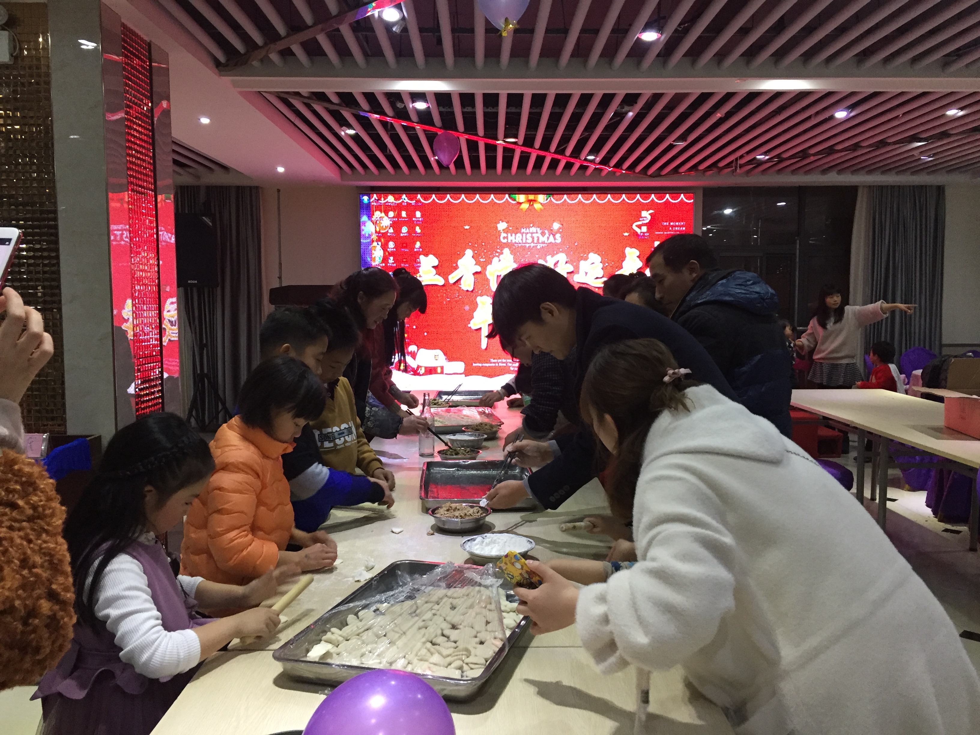 为践行十九大精神,弘扬中华优秀传统文化,我们特别邀请了3名外教参加此次活动。为了让外国友人和孩子们体验中华传统文化,我们邀请了白案师傅教授大家如何擀饺子皮和包饺子。同时,为了增加活动的趣味性,还进行 “最美饺子”评比活动。经过一个小时的辛勤劳动,大家包了2000多个饺子。