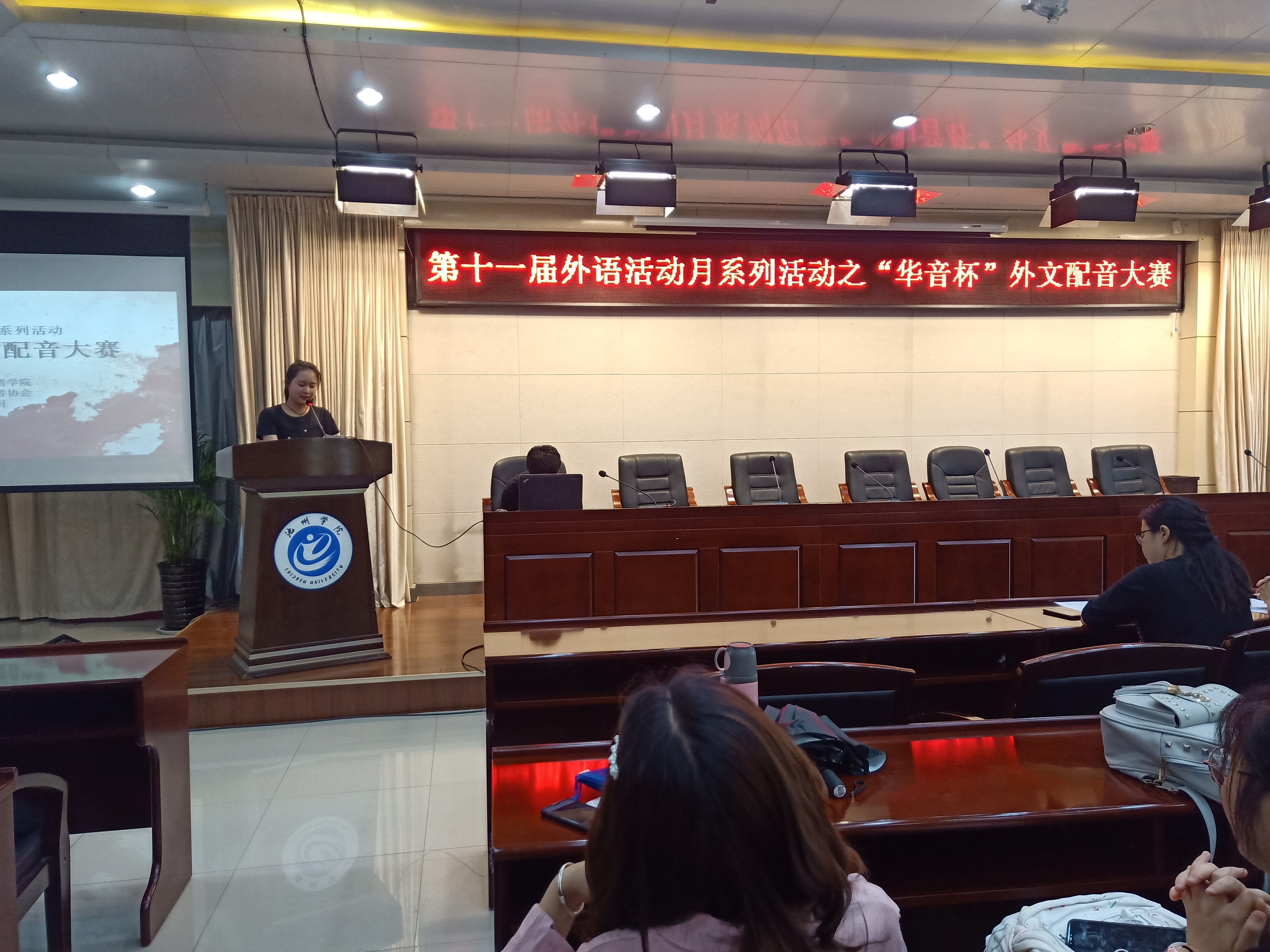 为培养学生学习英语的兴趣,提高学生英语口语表达能力和语言素养。5月30日下午,外国语学院在行政楼南二楼会议室举办了第十一届“外语活动月”系列活动之“华音杯”外文配音大赛决赛。外国语学院专业教师刘翠萍、高扬、宋婷担任本次大赛的评委,来自各个学院的100余名学生观看了比赛。