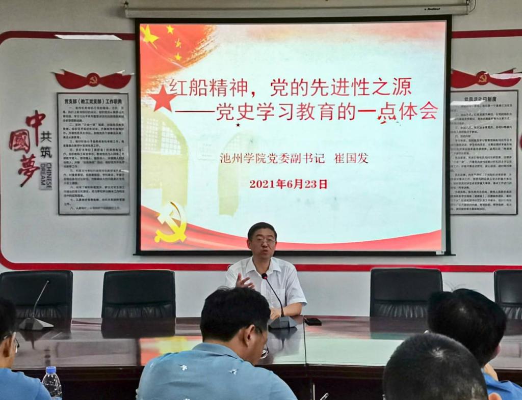 崔国发从红船精神的重要内涵、红船精神的时代价值、红船精神的实践要求等三个方面深刻阐述了“红船精神”。他指出,红船精神所承载的是首创精神、奋斗精神、奉献精神,是激励我们党顽强奋斗、不断发展壮大的精神动力,是我们党立党兴党、执政兴国的宝贵精神财富,也是新时代坚持和发展中国特色社会主义的坚强精神支撑。崔国发勉励文学与传媒学院全体教职工要结合时代特点,弘扬红船精神,在党史学习教育中践行为党育人、为国育才的使命。要赓续红船精神,汲取力量、奋楫前行,做学生为学、为人、为师的示范。